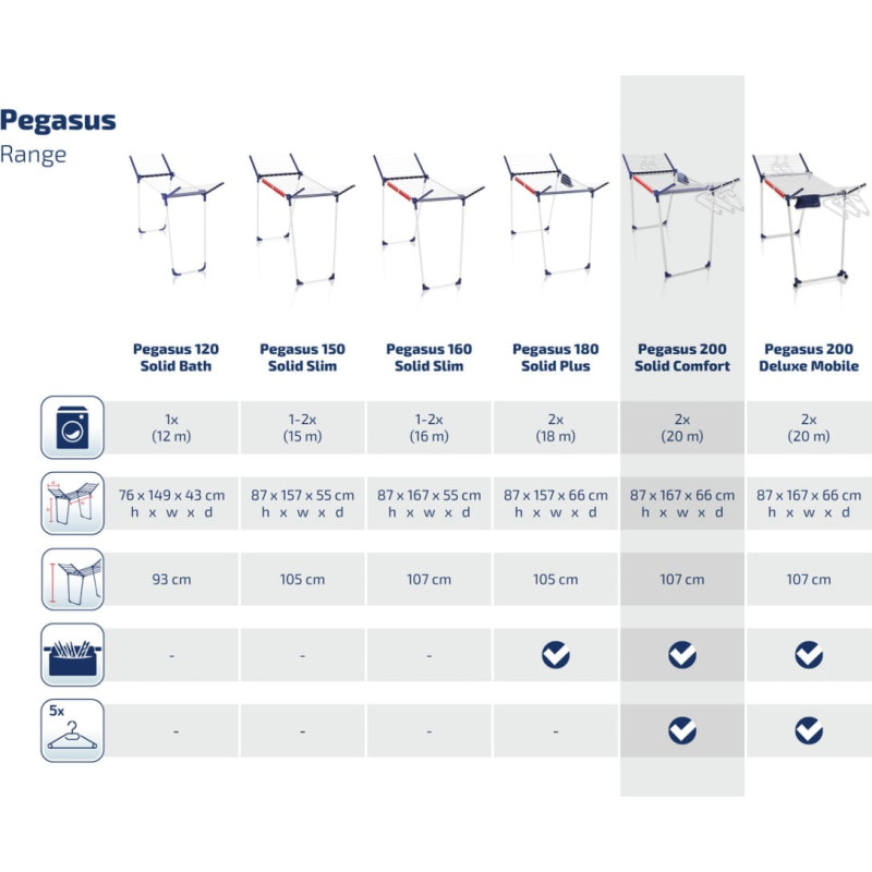 Leifheit Pegasus 200 Solid būs stabils, ietilpīgs, praktisks palīgs veļas žāvēšanā gan dzīvoklī, gan dārzā. Tā stabilitāti nodrošina kājas, kas veidotas trapeces formā, kas savukārt, ļaus žāvēt veļu ārā pat stipra vēja laikā.