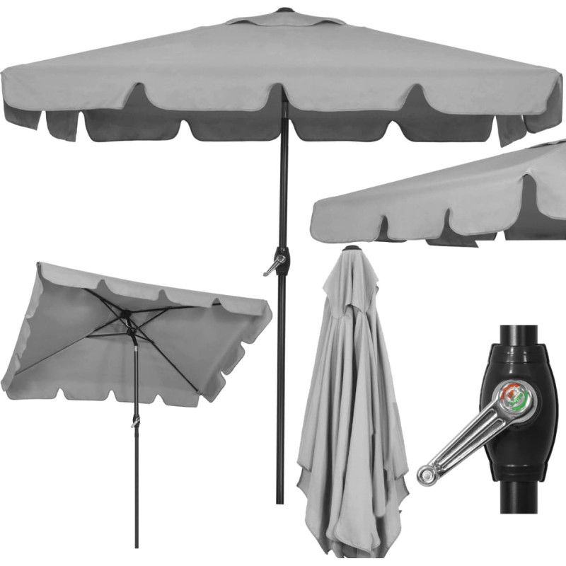 Canopy color: light gray Color of steel structure: black Material: 100% polyester / steel Construction: 4 panels - rectangular canopy Unfolding mechanism: crank Possibility to adjust the angle of the canopy: yes Dimensions: Width of the canopy after the material: 166 cm Length of the canopy after the material: 240 cm Total height: 220 cm Height from the ground to the valance: 165 cm Umbrella span along length: 195 cm Umbrella span across width: 122 cm Ventilation opening: 34 x 20 cm Ruffle above the ventilation opening: 50 x 32 cm Width of 1 shorter panel at the edge of the canopy: 122 cm Width of 1 longer panel at the edge of the canopy: 195 cm Ruffle width: 17 cm Ruffle length: 47 cm Width of the closed canopy (measured at the bottom): approx. 30 cm Length of closed canopy: 132 cm Mast tube diameter: 32 mm Metal thickness in the mast tube: 1.2 mm Canopy tube profile: 2 x 1 cm Crank length: 11.5 cm Handle length at the crank: 8 cm Additional information: Easy and quick to fold and unfold Possibility of "breaking" and adjusting the inclination of the canopy Waterproof material: yes Simple and easy assembly and disassembly A large canopy that will shade a large area The set does not include the umbrella base.