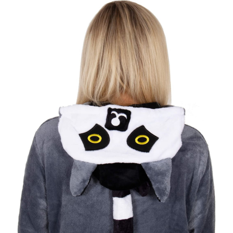 Pattern: lemur Material: polyester 100% Color: multicolor Size M The hood is not detachable, without drawstrings Number of pockets: 2 Closure type: 1x zipper (back), 1x buttons (front) Additionally: beautiful design - eyes, nose, ears and tail Dimensions: Total length with hood: 170 cm Total length without hood: 140 cm Width under the arms: 60 cm Leg length: 50 cm Sleeve length: 60 cm Tail length: 115 cm