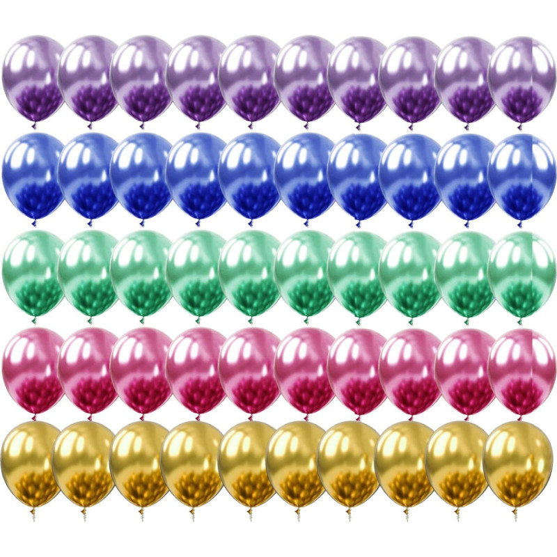 Basic features:Brand: Springos® Quantity of pieces in the set: 50 + tolerance + /- 2 pieces Color: multicolored Inflated height: approx. 40 cm Material: latex The set includes:10x balloon metallic purple 10x balloon green metallic10x balloon gold metallic 10x pink metallic balloon 10x blue metallic balloon