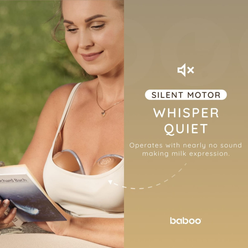 Enjoy total freedom of movement with the baboo® hands-free wireless breast pump — no tangled cables, perfect for multitasking moms. • Whisper-quiet operation (up to 50 dB) • Discreet, wearable design • Compact and travel-friendly • Easy one-touch LCD control • 4 modes with 9 adjustable suction levels • 180 ml milk collector • Up to 90 minutes of battery life • Anti-backflow hygienic system Box includes: dust cover, 24 mm silicone breast cushion, motor unit, silicone membrane, USB Type-C cable, 180 ml milk collector, bra adjustment clip, valve, carry bag and manual.